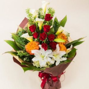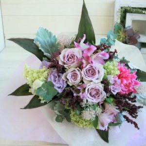 季節の花々を束ねてラッピングした華やかな花束。お誕生日や送別、ちょっとしたお礼などの気持ちをさりげなく伝えたい場面におすすめ。