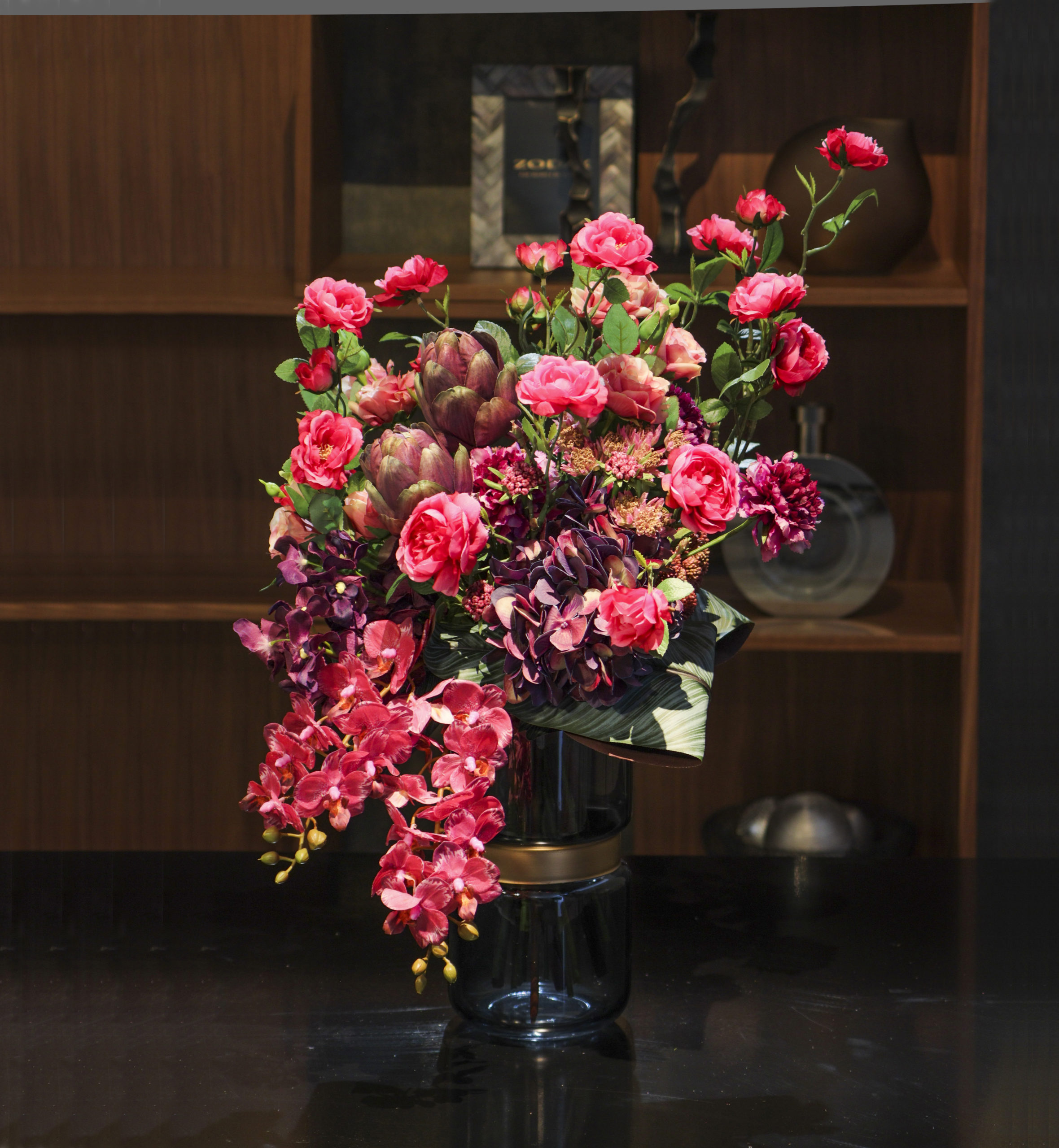 深みのある赤やピンクなど重厚感ある色合いなので、モダンな空間を華やいだ雰囲気に彩ります