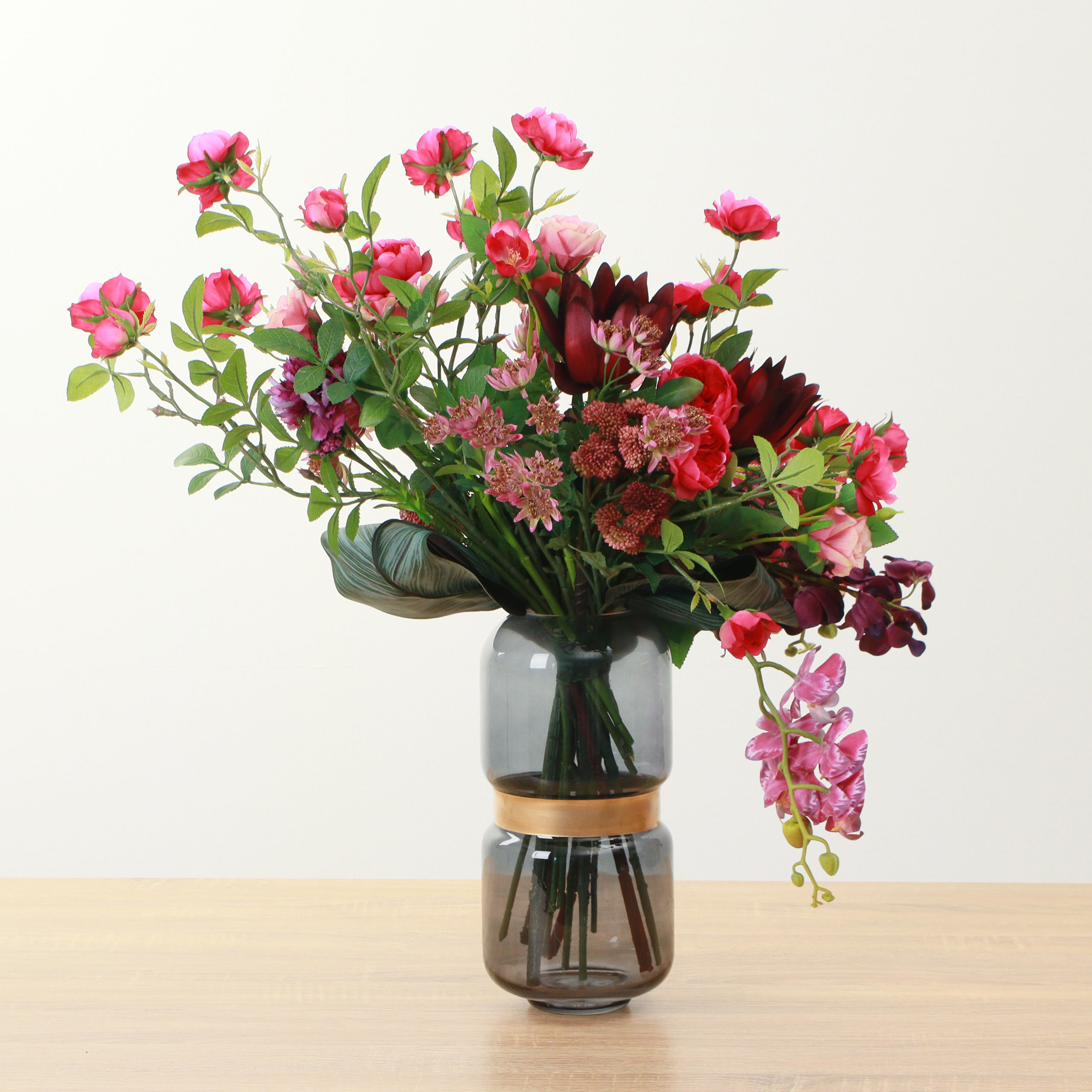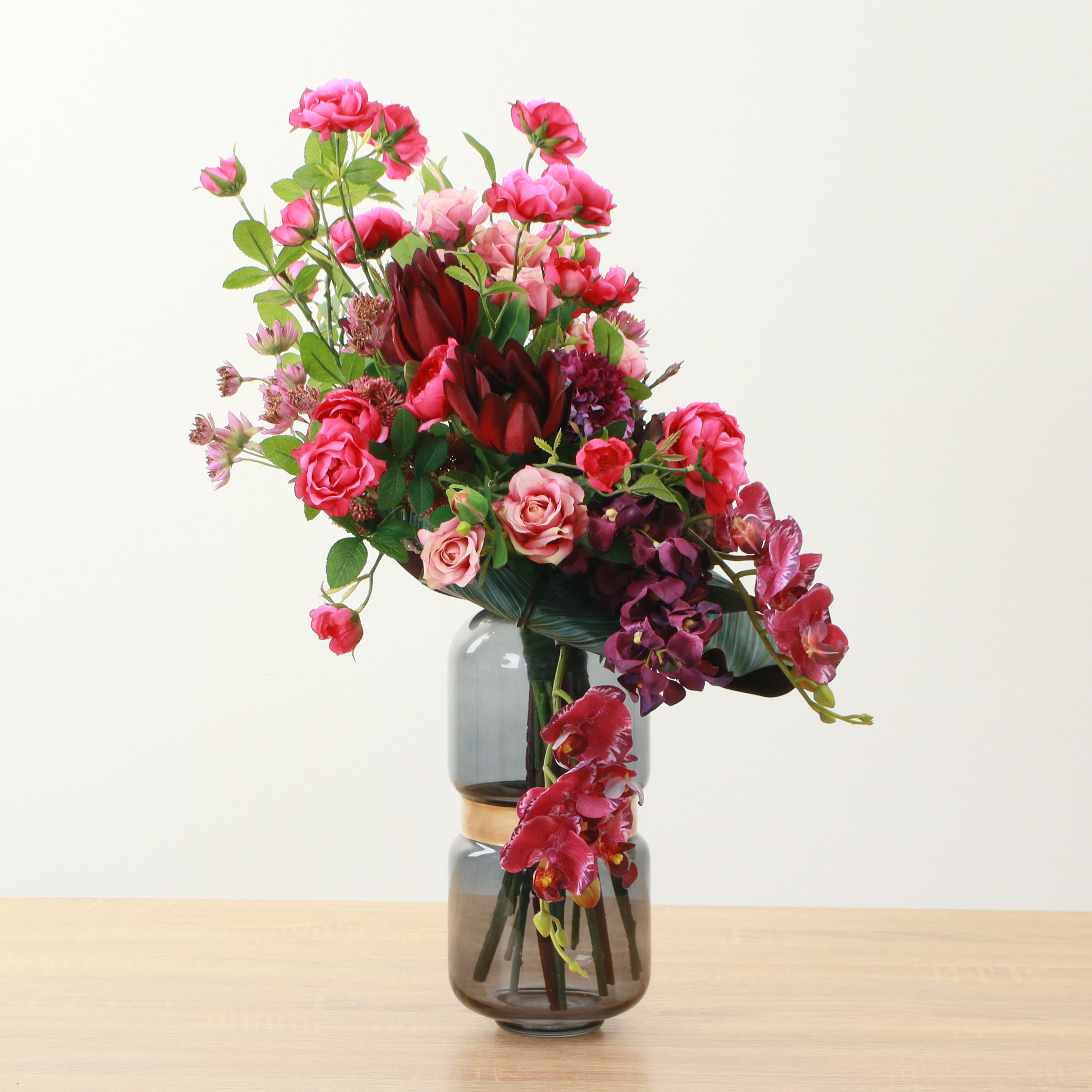 本物のような質感のバラと、丸みのある上品な花でまとめたデザインは、