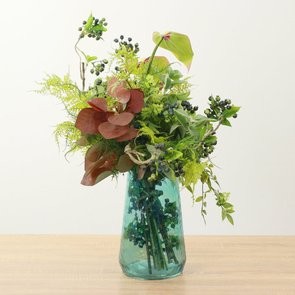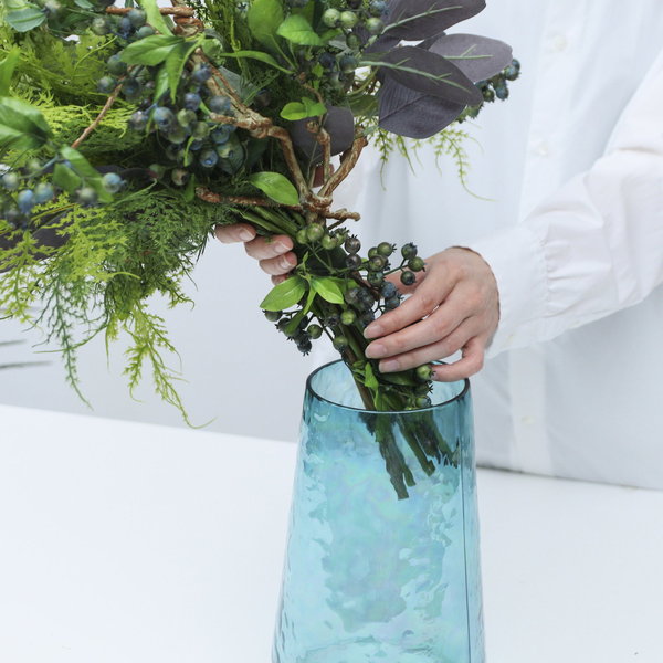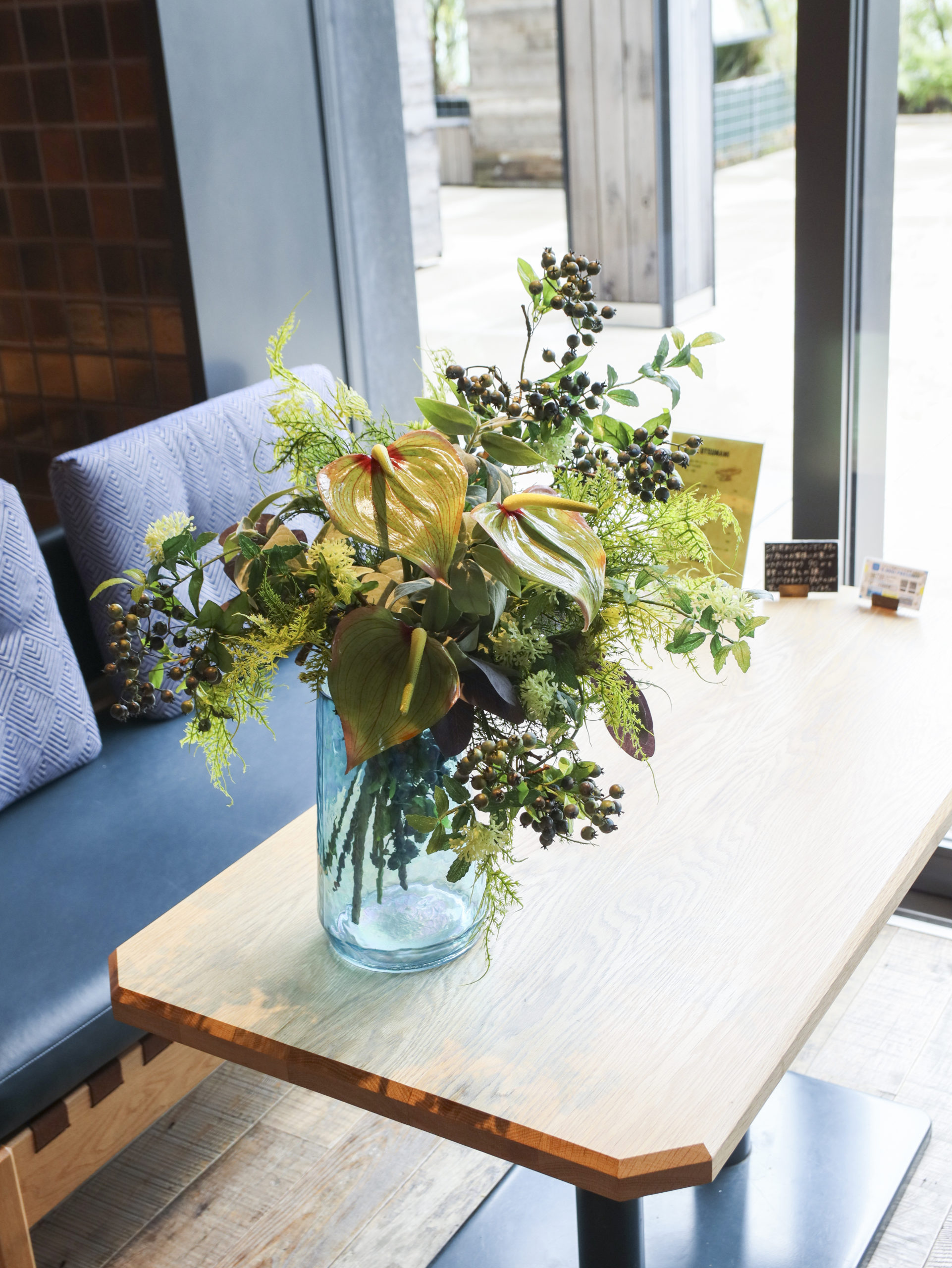 ブルーの花器をアクセントカラーにすることで抜け感のあるスタイリッシュな空間を演出します