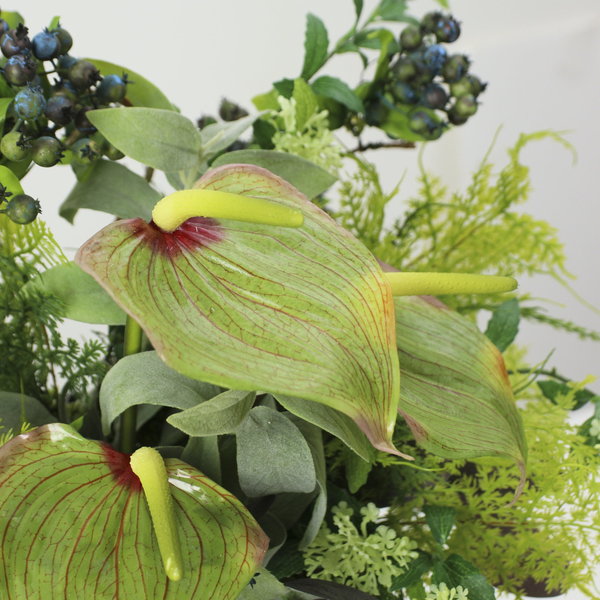 個性的な花やグリーンを組み合わせた遊び心あふれる軽やかなデザインは、