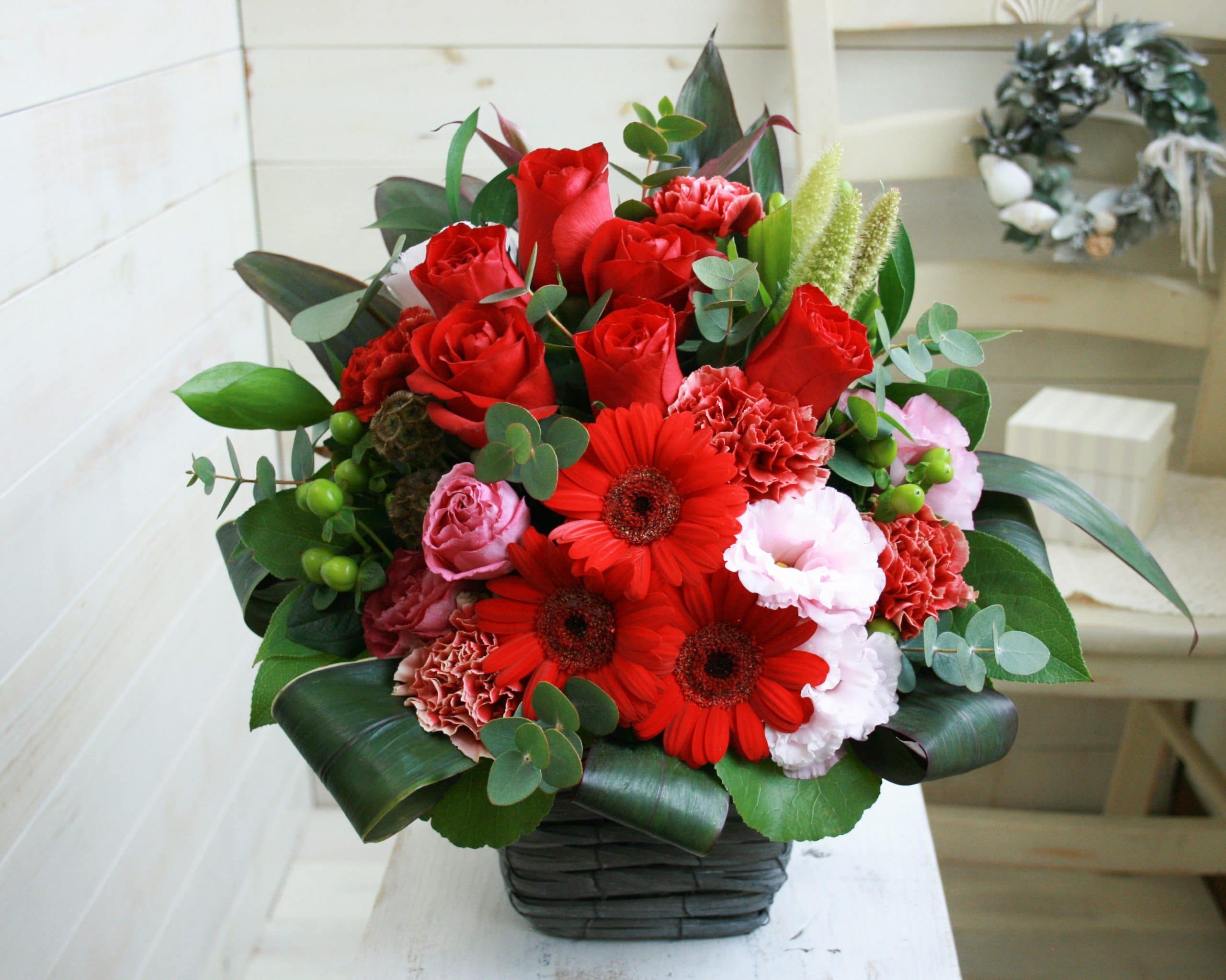 赤いお花をメインに作った高級感のあるアレンジメントです。