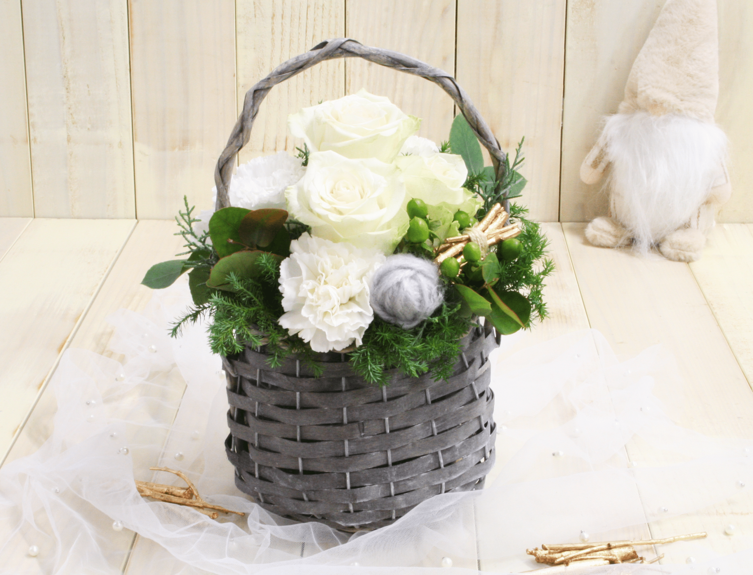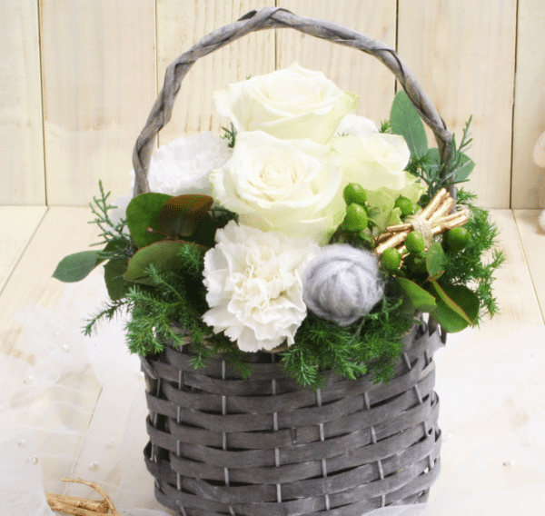 白バラをメインにしたホリデーシーズン限定のアレンジメント