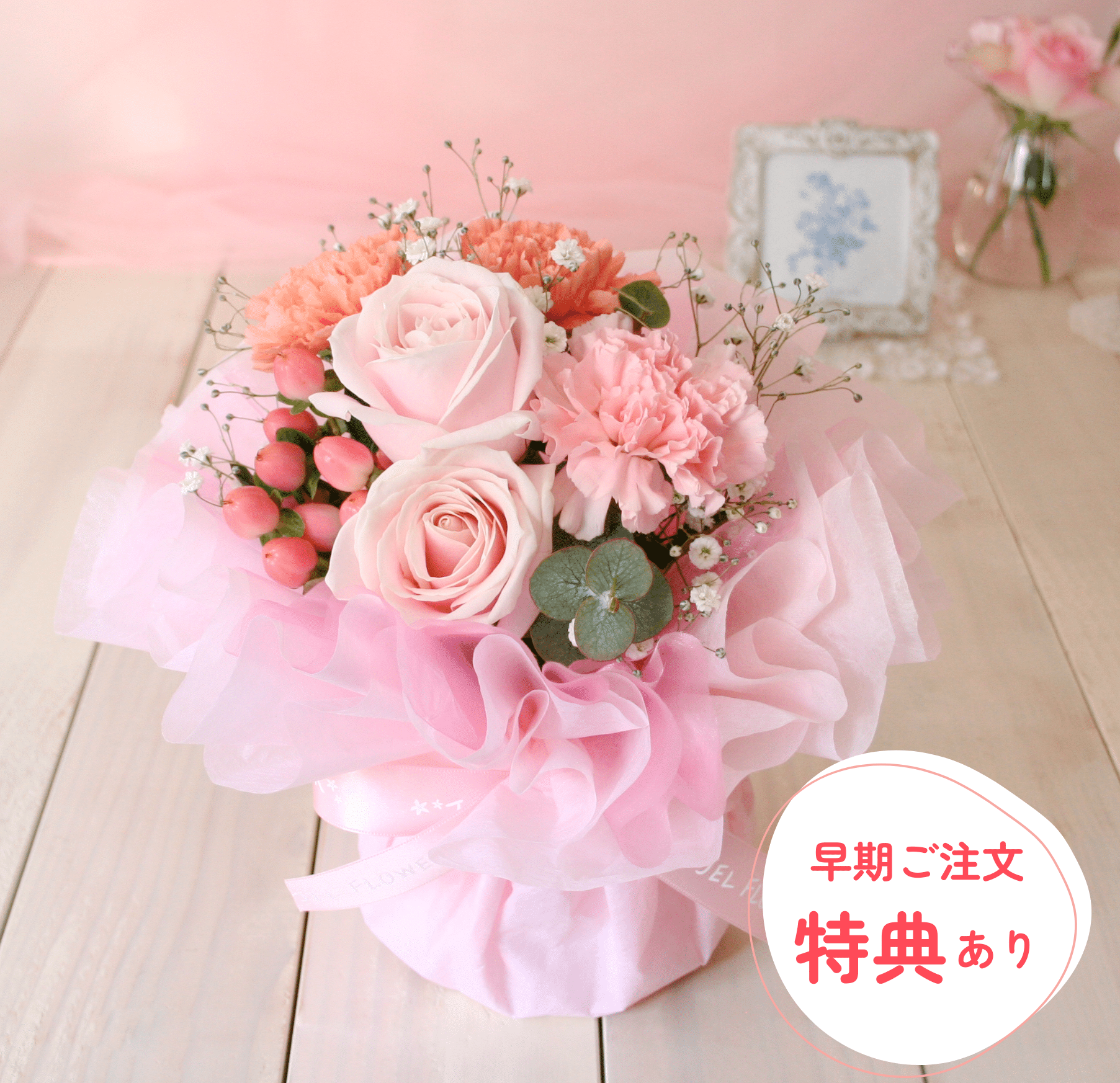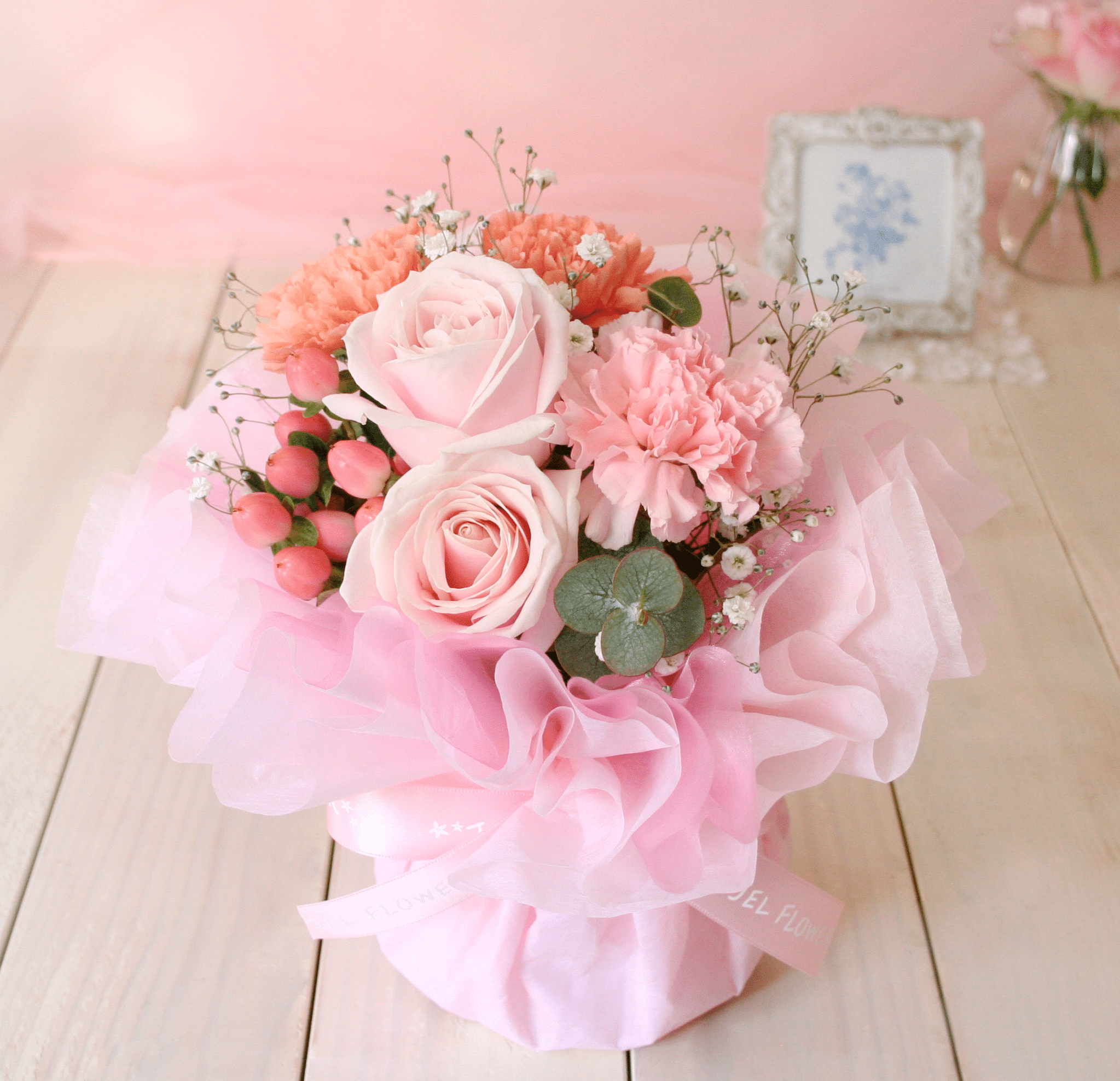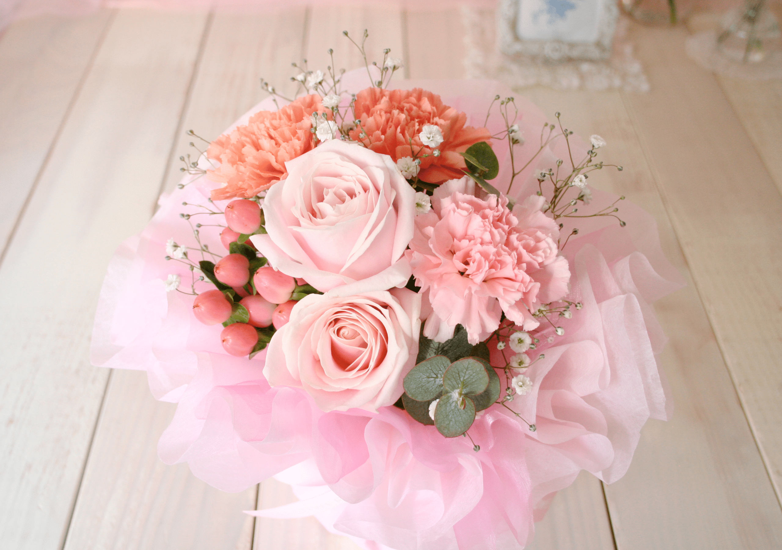 ピンクのバラとオレンジ系カーネーションがメインの優しく温かみのある雰囲気のブーケです